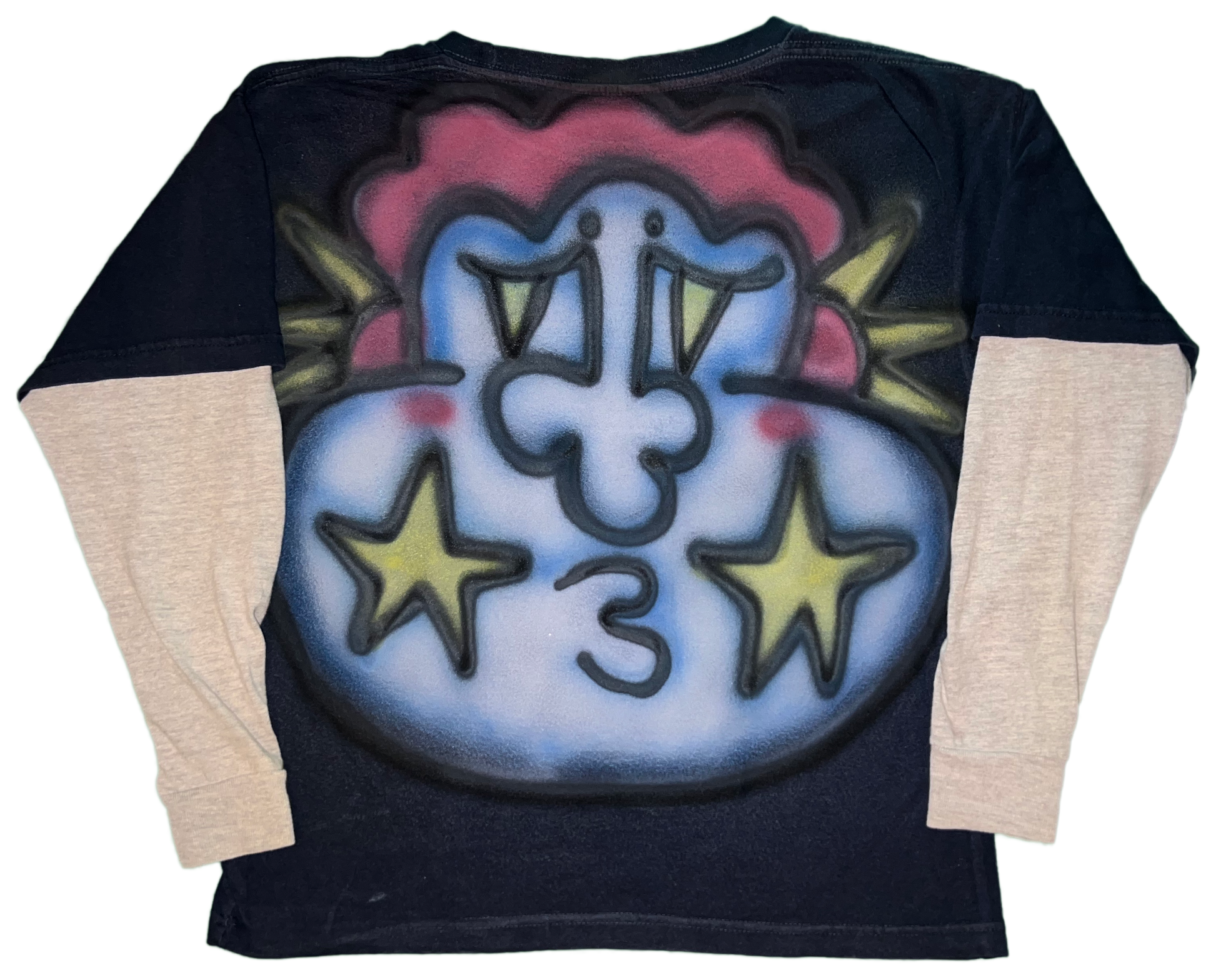 1of1 Airbrush Design on Thrifted Clothes MADE TO LAST. Size Small. TREAT LIKE ART. WEAR WITH CARE. COLD WATER LOW SETTINGS ON MACHINE OR HAND WASH INSIDE OUT. TUMBLE DRY LOW OR HANG DRY.